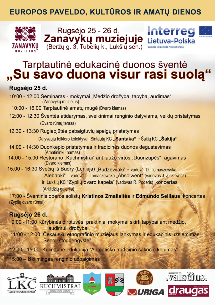 Mugėje dalyvaus dainuojančios grupės iš Budry miesto kultūros centro ir parodos dalyviai iš Budry komunos. medus, keramika, rankdarbiai ir audimas. Tai bus vienas iš Tarptautinio mokomosios duonos festivalio „Visur rasite suoliuką su duona“ programos elementų. 2 dienų renginio vedėjas bus Zanavykų muziejus, nukelsiantis dalyvius į XX a.