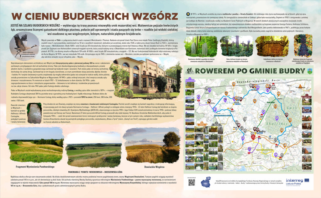 SZLAK BUDERSKICH WZGÓRZ (12,6 km) – wybierając tę trasę poznasz niezwykły urok mazurskiej wsi. Malownicze pejzaże kwiecistych łąk, urozmaicone licznymi gatunkami dzikiego ptactwa, połacie pól uprawnych i stada pasących się krów – rzadkie już widoki sielskiej wsi osadzone są we wzgórzystym, naturalnie pięknym krajobrazie. Oznaczenie: kolor żółty