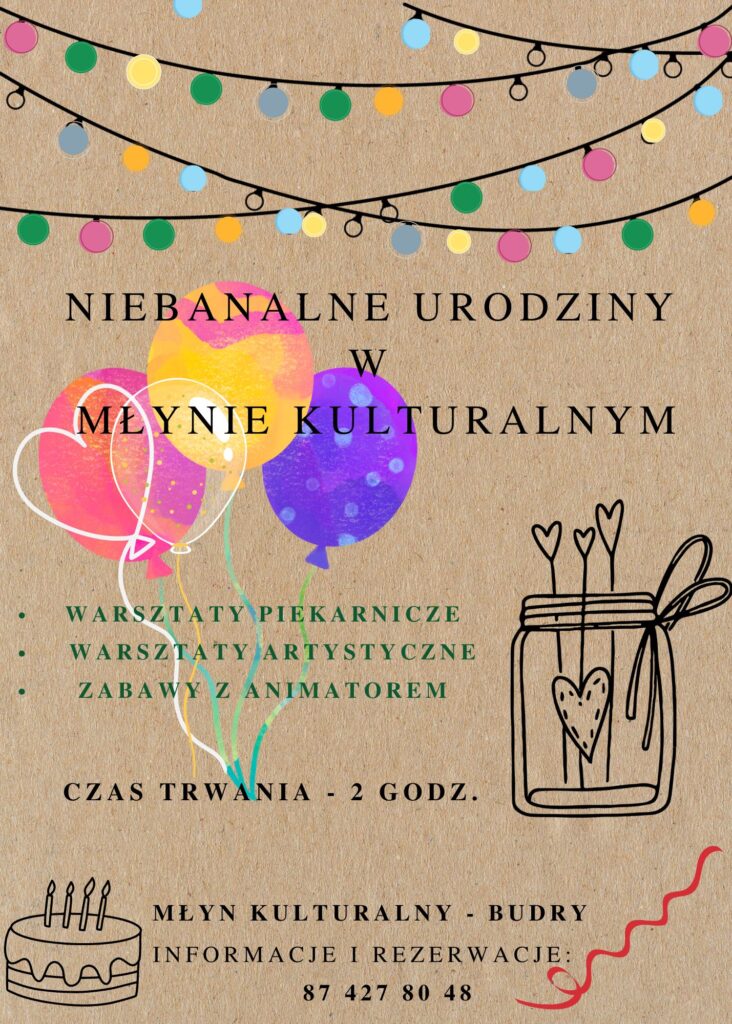 Młyn Kulturalny umożliwia zorganizowanie urodzin dla dzieci. Przyjęcie urodzinowe to dwa bloki warsztatowe podzielone blokiem artystycznym, w ramach warsztatu jubilat wybiera jeden z dostępnych tematów dla wszystkich uczestników, w zależności od zainteresowań jubilata. Przewidywany czas imprezy to 2 godziny.